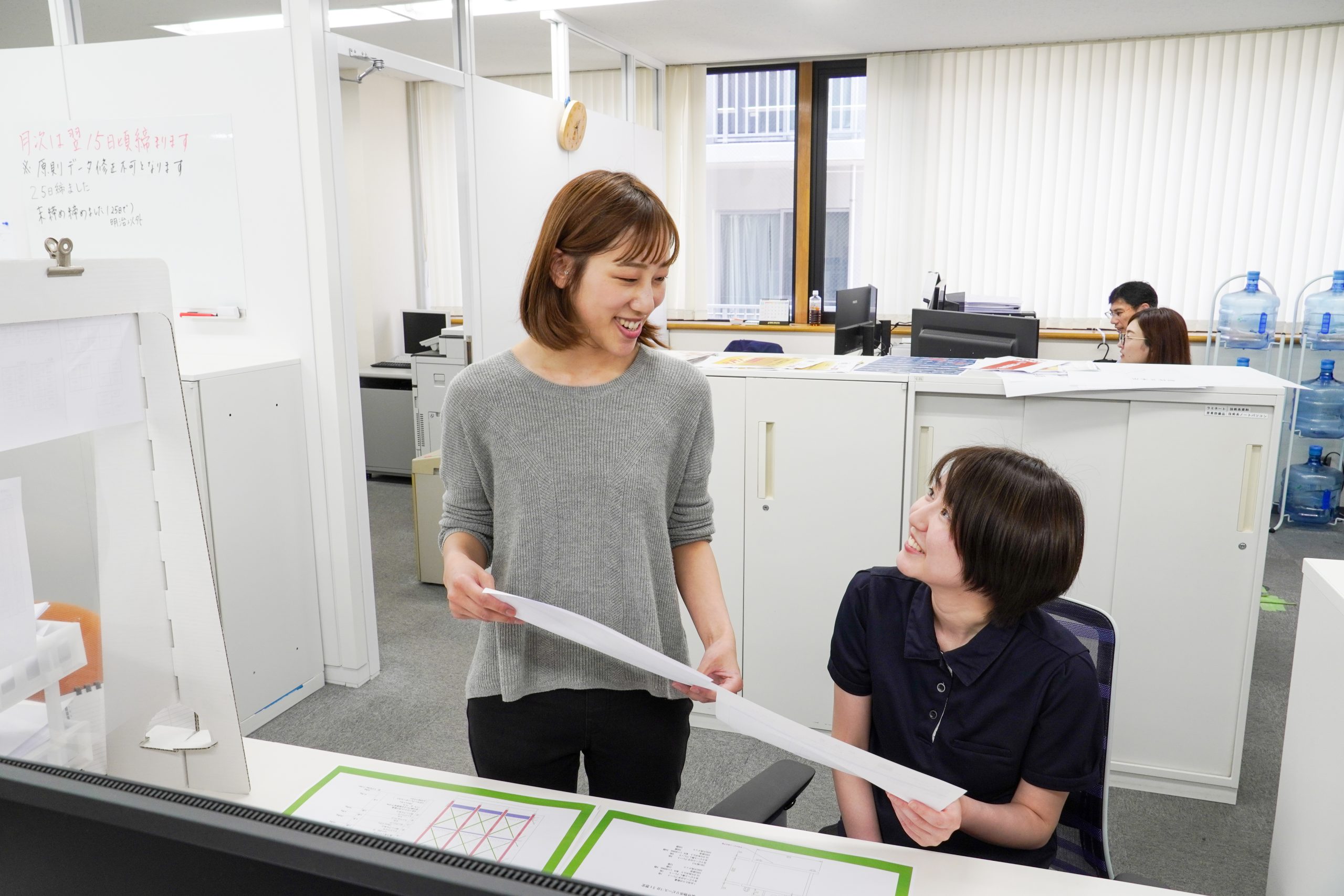 完成した計画図面を営業担当に共有し、提案内容を確認します。細かな意図や注意点も伝え、営業が自信を持ってお客様へ提案できるようにサポート。現場成功に向けたチーム連携を支えます。